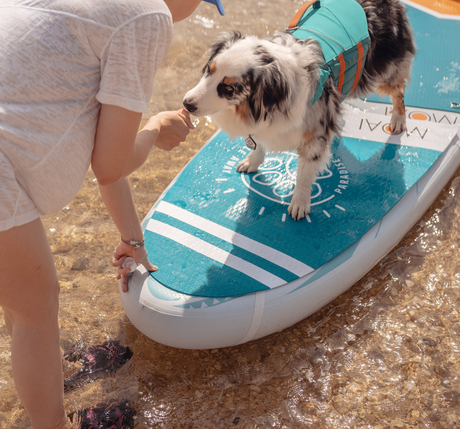 The MOAI 12’4”, 10’6”, and 10’8”boards are great options for paddleboarding with your dog. These boards are wide and stable, making them ideal for balancing both you and your furry friend comfortably.